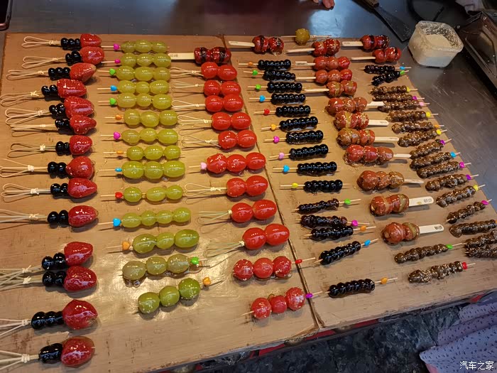 糖葫芦,现在得糖葫芦品种多,水果多,除了山楂外增加了山药蛋、普泰、桔子、圣女果这些水果,