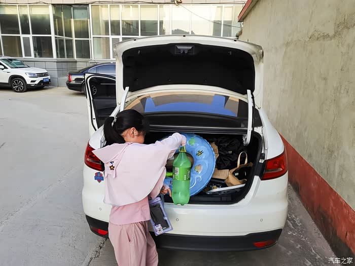满满的后备箱,小女儿的游泳圈昨天晚上就给打了气,不过后来才发现,其实到现场打气也可以,提前打气反而占地方。
