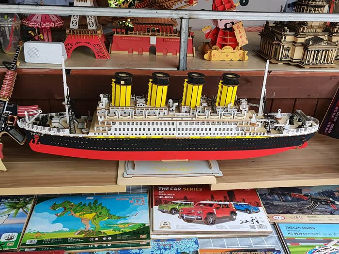 这个拼接的泰坦尼克号很吸引我的研究,这家店主要卖旅游纪念品。