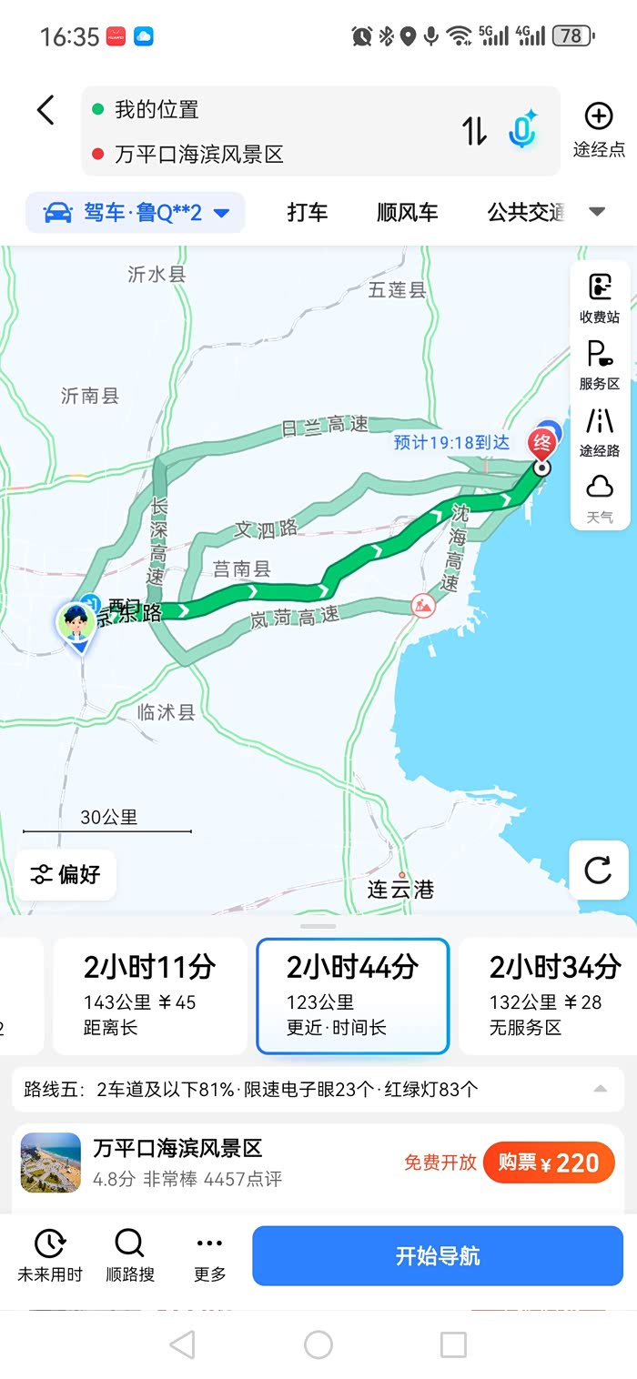自驾路线:高速走日兰高速或者岚菏高速到可以,单程路费49元,走文泗路一直走经莒南、临港也可以,不花钱。