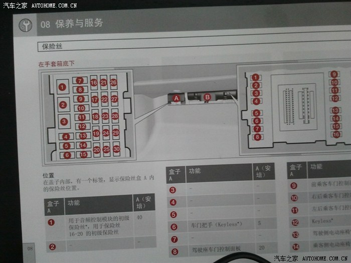 拿出车主手册,确定相应保险丝,保险盒的位置。说明就在手套箱下方。