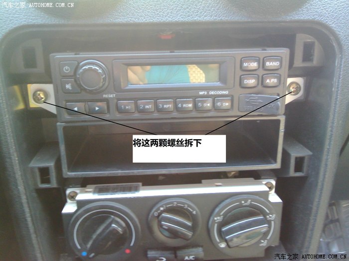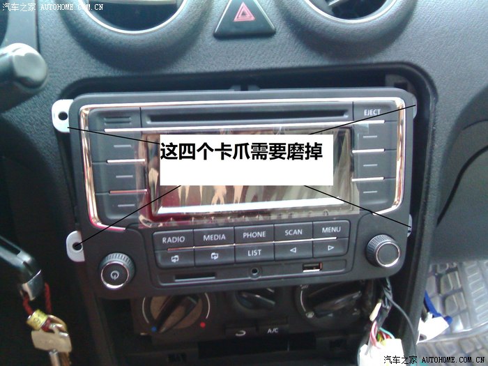 上面的工作做好之后将线插上就可以了,不需要从新制作支架,就用原车支架就可以不过只能将上面的两颗螺丝扭上下面的被面板挡住了,面板打磨的时候做好事先量好尺寸,一点一点打磨,千万不要着急磨大了,本人耗时3小时才将面板磨好。这里需要注意的是面板后面有六个卡爪,上面的两个要磨到只剩一毫米厚左右,几乎就是剩一小点,中间的两个直接磨掉,下面的不要动。
