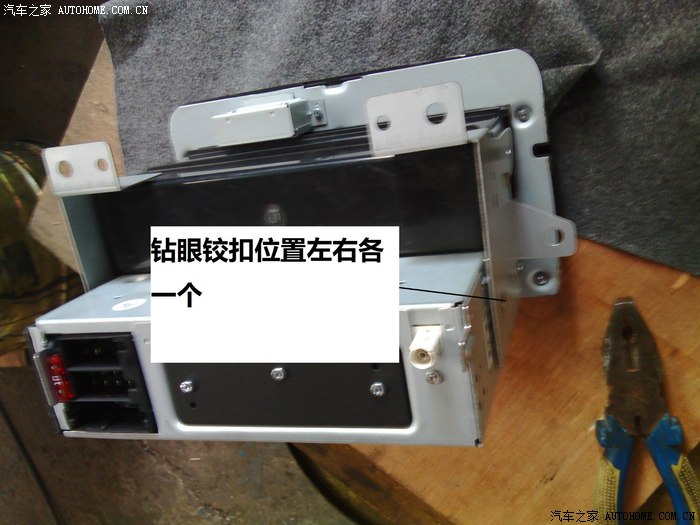 这里需要注意的是见原车的收音机支架和储物盒安装到新cd上,然后在cd上钻两个眼铰扣将支架固定在上面。