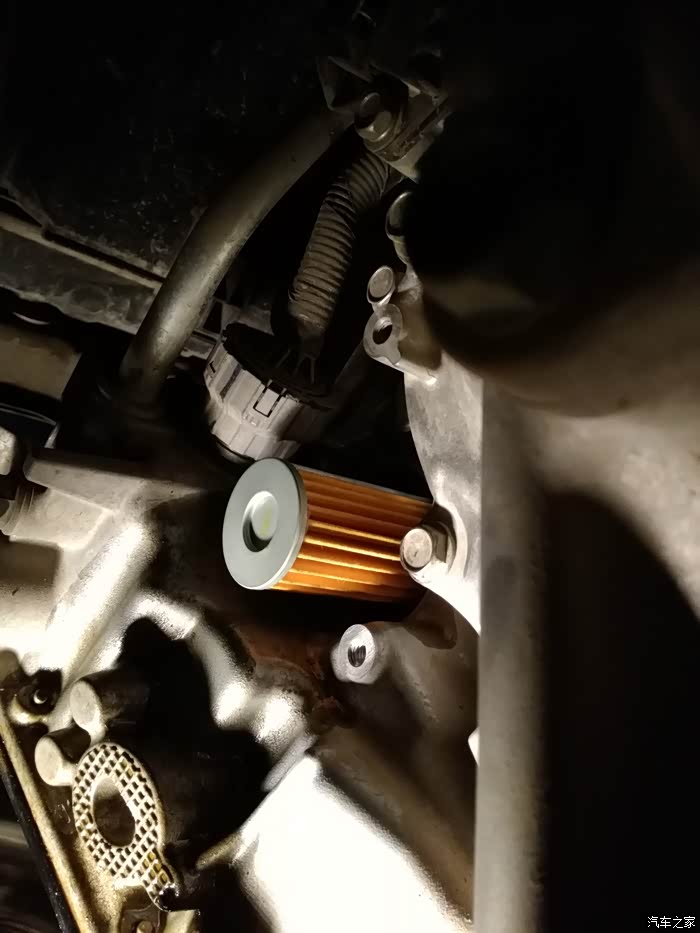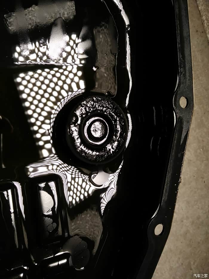 我用抽油桶吸出来4升左右,然后下面拆油底壳放出来。你看这个状态哪儿能免维护嘛!注意变速箱油底壳有些有放油螺丝,有些没有。不像机油油底壳。没有的话里面拆开有很多油要留下来,如果你不抽掉,那么一定要用大盆子接着。