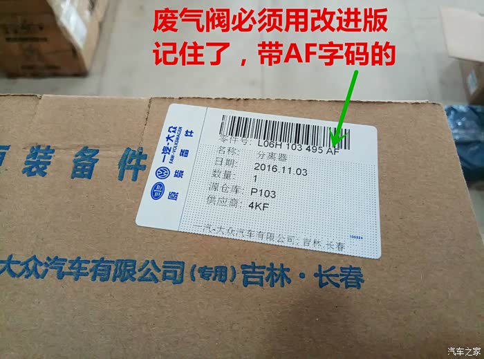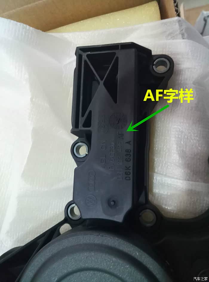 3、另一个就是油水分离器,也就是俗称的废气阀。从EA888出来至今,厂家已经出过N个版本的废气阀,外观都是一模一样。这里我就透露个秘密给大家,目前耐消耗的废气阀只有一个型号,就是AF的,自己看图吧。