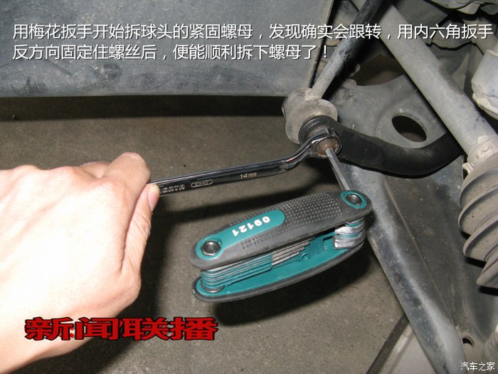 向左或向右打死方向(更换左球头向左打死,反之向右)——使用14MM扳手和5MM内六角扳手,在车轮处拆卸球头上下螺母——车轮摆正——躺车头底下升手取下旧球头,安装新球头(此时新球头上两个螺栓和车底安装孔是吻合的),用手拧上螺母——再向左或向右打死方向——使用扳手完全紧固螺母,试车OK!