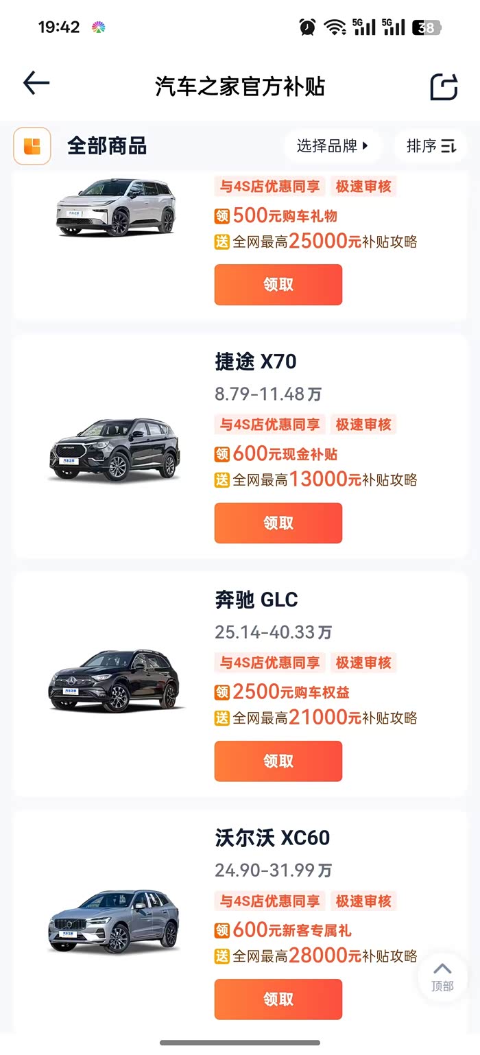 汽车之家官方的补贴活动,覆盖“上千款车型”都可领取,最高可领4000元补贴;且与厂家无关,可与4s店优惠同享优惠。比如:捷途X70 ,用户都享有600元现金补贴,且与4s店优惠同享。其他很多车型都有补贴可领取,直接搜索车型就会看到的。