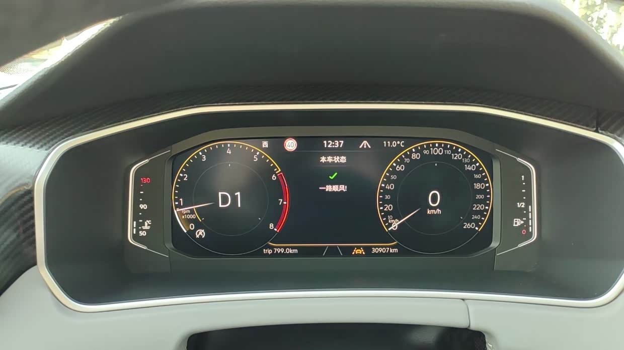 在配置方面也中规中矩,像中控显示屏,尺寸不算大但比以往大众的要大,界面简洁直观,提供了导航、娱乐、车辆设置等多种功能, 全液晶仪表盘,显示清晰内容也全面,还有一键启动、电动后备箱,这些也都配置上了。