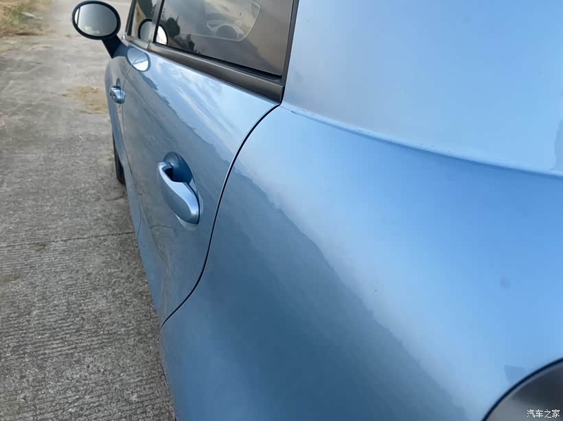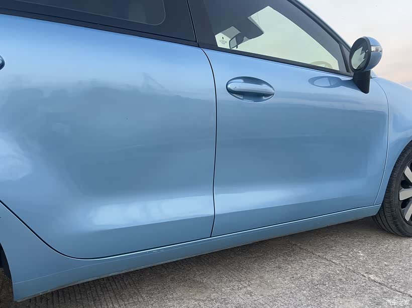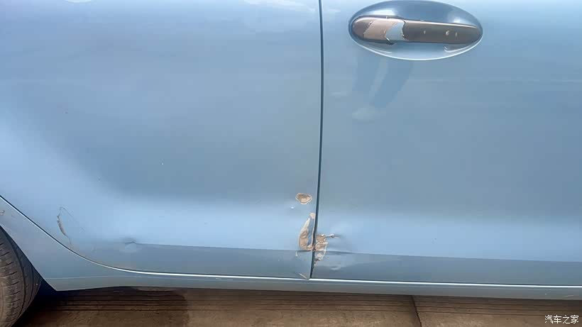 右侧两车门需要钣金喷漆。除此之外车身还有几个比较明显的坑,好在都没掉漆。门把手上是贴的膜没撕干净。