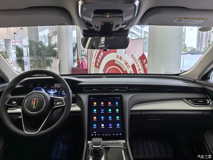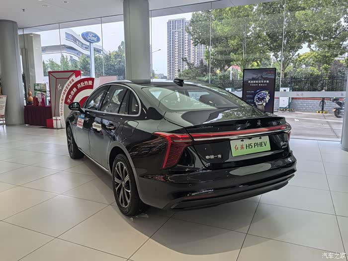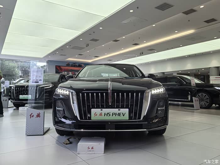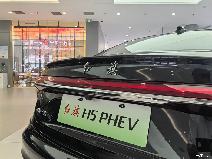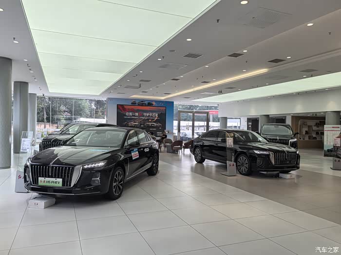 展厅整体非常亮堂且干净整洁,进门放眼望去都是黑色展车,真不愧是最畅销的颜色,C位当然是今天的主角:红旗H5 PHEV。