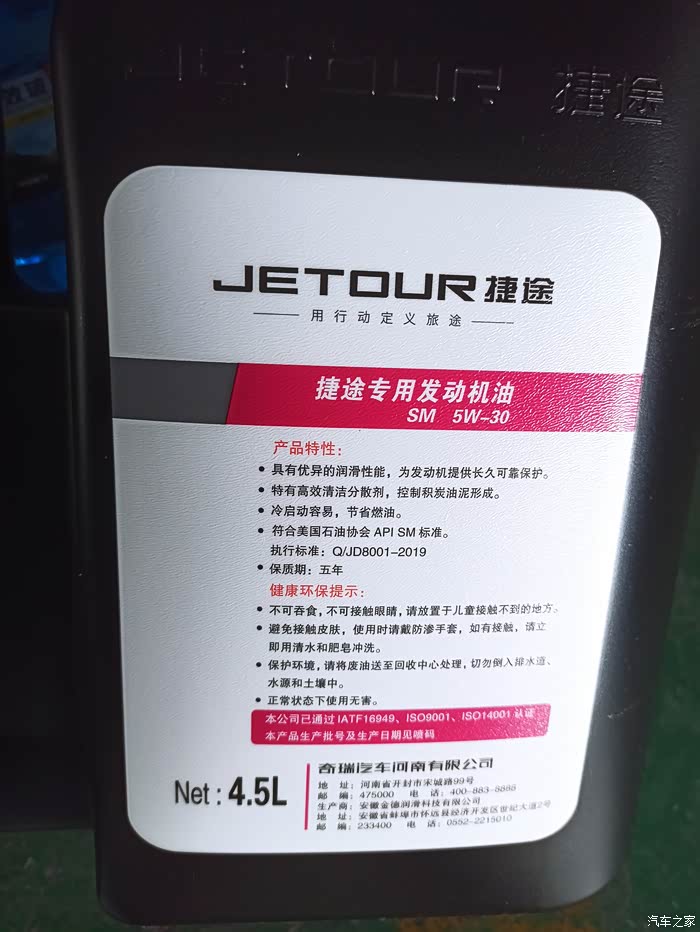 ,而更换安装自己动手一毛钱也不用(下次自己搞了,很简单,如果有熟悉的修理厂,绝不会收费的)。机油是捷途专用的,标记是5W_30的,但是肉眼观看粘稠度,感觉不如JIN美孚