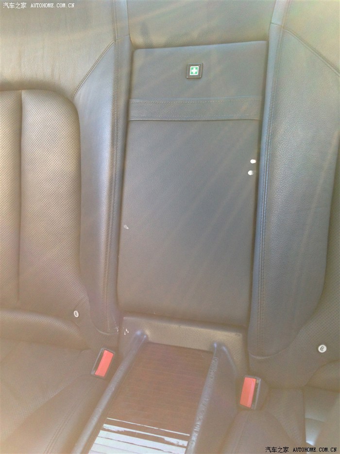 后扶手箱,前任车主真皮有点没保养好,不懂中间的绿十字是干嘛的,中间是个储物箱,可以放四瓶矿泉水,很实用,中间的突起太高,不适合坐第五个人,也没安全带