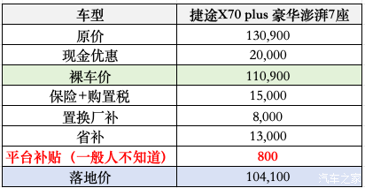 捷途 X70 Plus 豪华澎湃7座:130900-20000(现金优惠)-8000(置换补贴)-13000(省补)+15000(保险&购置税)-800(汽车之家平台补贴)=104100