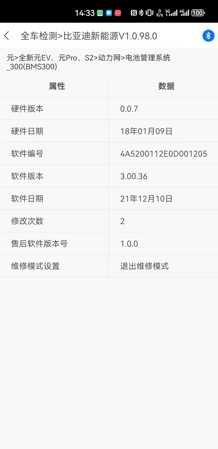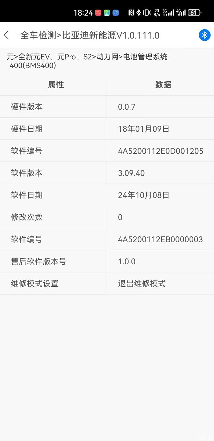2020年1月购元EV535,目前总里程11.4W。之前没关注过BMS版本,2024年7月,在续航明显下降的情况下,满电不到250KM,去4S店做了电池容量标定,续航有所改善,后来在论坛发现车友用设备可以自己查看车辆数据,购后测得BMS版本为3.00.36,满电430V,单体不到4V,就是大家说的锁电版。2024年12月,到店要求升级,升级后版本3.10.40,满电435V,单体最高电压超过4V,最低电压不到4V,后来满电电压逐渐下降,7月初只有424V,上周去4S店保养,本想升到车友说的3.12.40,奈何无此版本,后来降为3.09.40,满电电压435V,单体最高、最低电压都超过4V,用用看,后期电压降不降低。