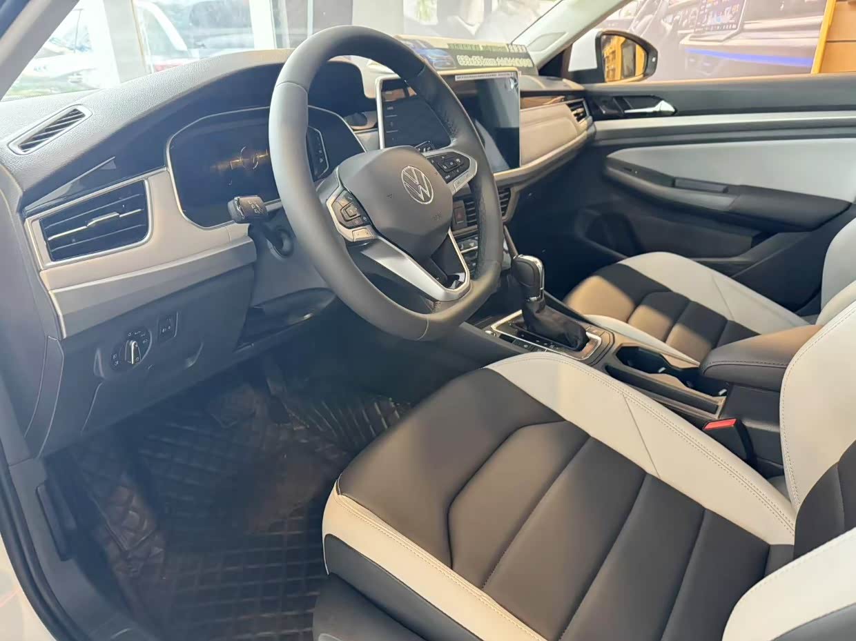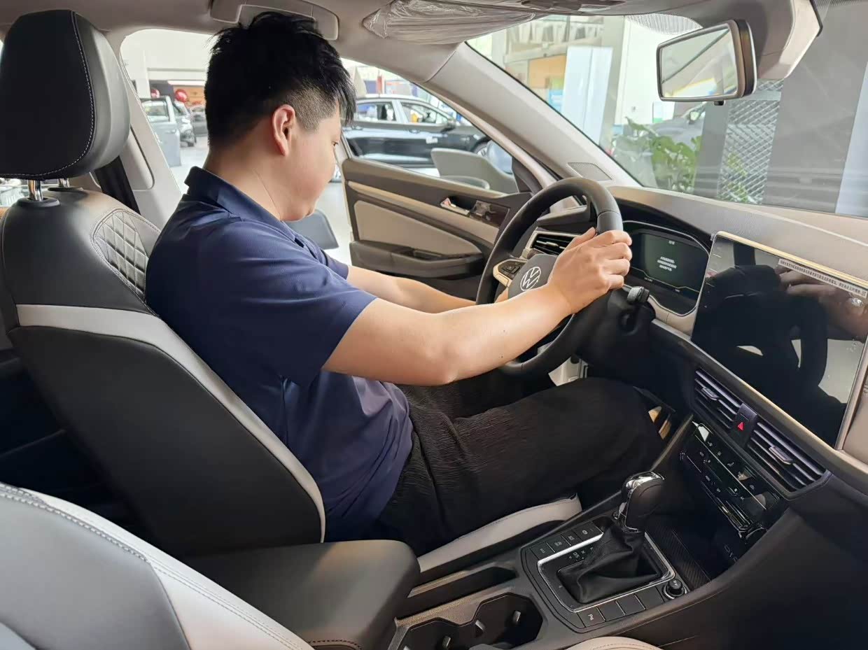 坐进车里,还是熟悉的大众风。全黑的中控台搭配黄白色皮革拼接,缝线让硬邦邦的塑料看起来稍微精致了一点。但一敲车门板,那硬塑料的声音就把成本控制四个字暴露得明明白白。大面积用硬塑料确实有点跟不上潮流了。