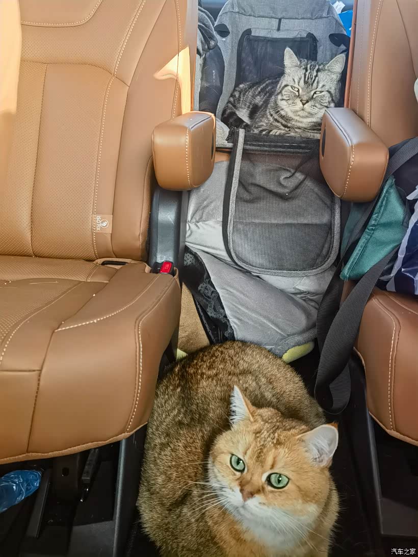 我特意观察了可乐和妹妹的反应:它们没有像往常一样蜷缩起来,反而大胆地趴在车窗边,透过玻璃看沿途的风景,偶尔还会互相舔舔毛、蹭蹭脸,一副悠然自得的模样。中午时分,阳光透过全景天窗洒进车内,暖洋洋的,可乐直接在第二排座椅上睡着了,小呼噜声清晰可闻,完全不受高速行驶的影响;妹妹则蜷在猫窝里,眼皮耷拉着,时不时伸个懒腰,显然也在享受这份安静与舒适。中途休息时,我打开车门,外界的噪音突然涌进来,可乐和妹妹下意识地抖了一下,连忙往车内缩,仿佛在说“还是车里更舒服”。这种极致的隔音,不仅让猫咪免受噪音刺激,也让我和家人在长途驾驶中少了疲惫感,听着舒缓的音乐,聊着天,原本枯燥的高速路段也变得惬意起来。