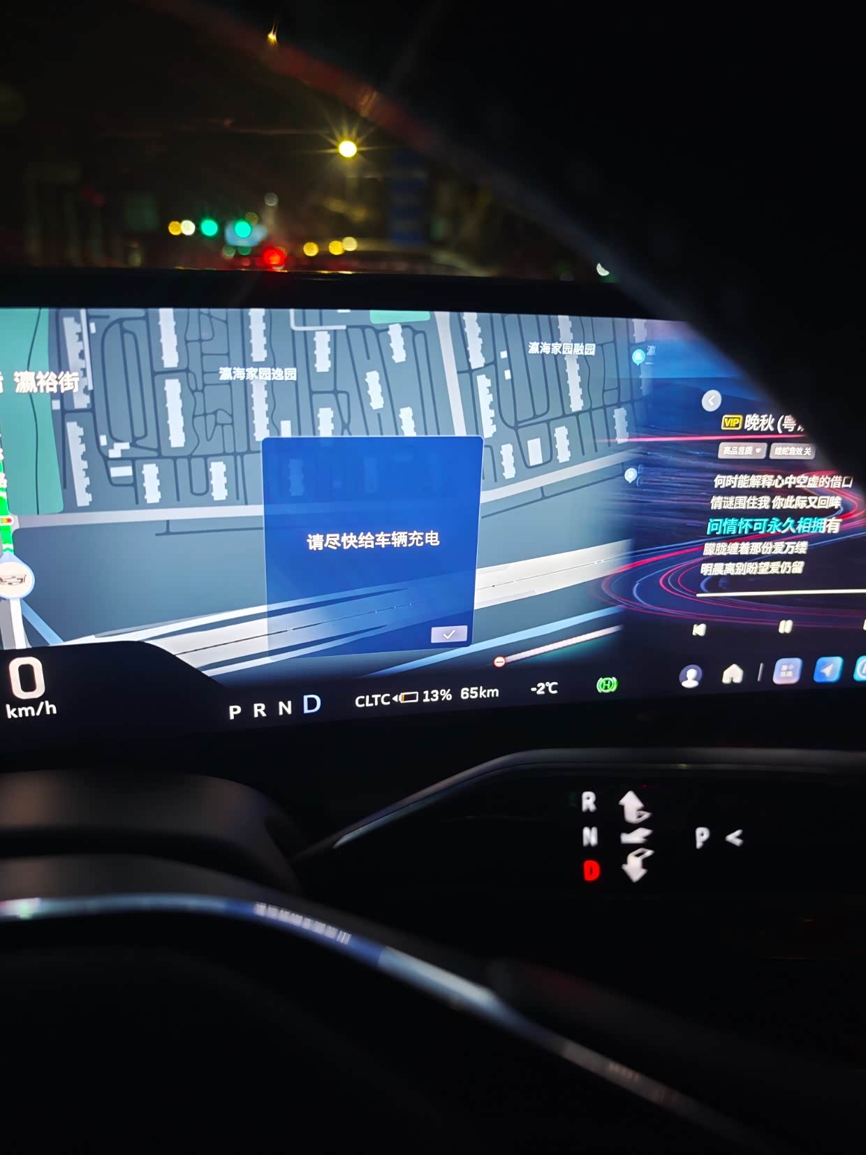 又将近两小时的行驶后,最终在剩余65km的时候,提示低电量:尽快给车辆充电!