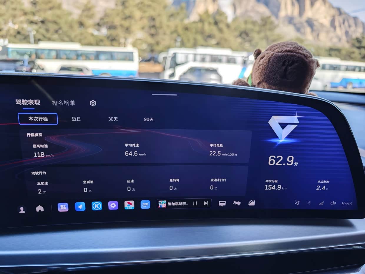驾驶成就显示实际开了155km,用时2.4小时,最高时速118km/h,平均时速64.6km/h,开着空调又爬坡,电耗较高为22.5kwh/100km。