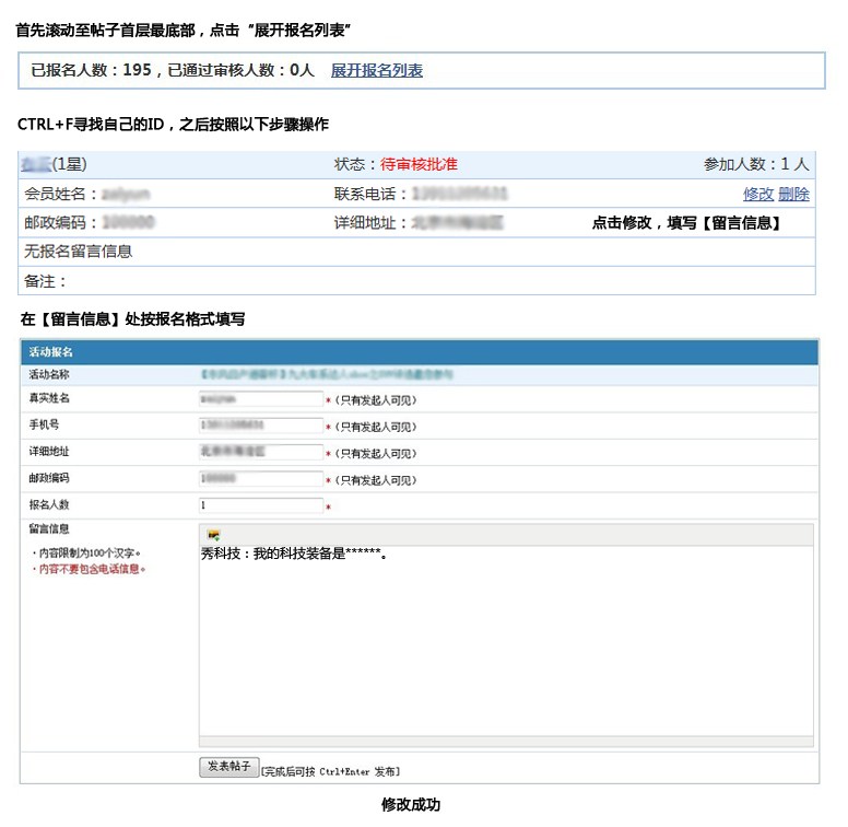 1、点击本帖“我要报名”按钮,真实完整地填写自己的个人信息。并在“留言信息”中如下格式留言并上传科技装备图片。