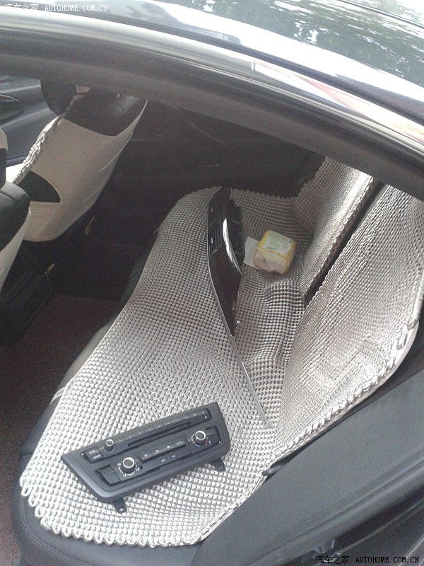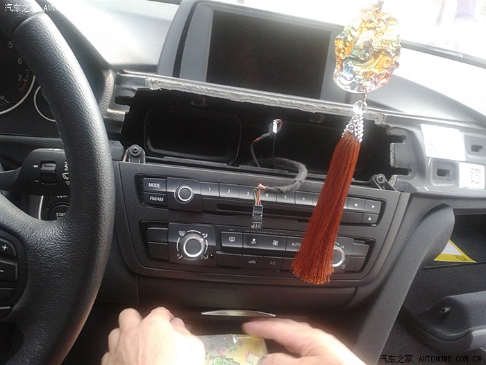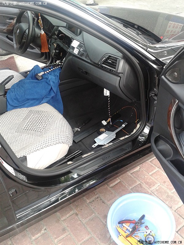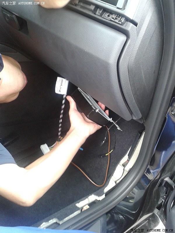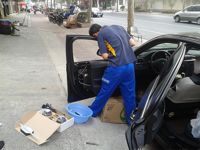 (去上海之前咨询了Larry很多问题,也问的很清楚,Larry也解释的很耐心及详尽。由于要拆车及走线,安装时间大概2-3个小时,本来约好上周四上午10点去装,结果我有事下午1点才到,刚开始安装的时候上海天色就已经在变化,肯定要下雨的。安装的陈师傅是山东人真的是值得我学习,拆车过程仔细但得心应手,整个过程没有断一根卡子。但安装过程呢一波三折,主要是功放安装好后陈师傅发现功放取电的电源线找不到了,这根红色的电源线是原装不能另配的,没这根电源线功放不能取电那基本就白装了,那个急啊!陈师傅呢说Larry早上一早就给他了,连同套装一起,我问陈师傅是否Larry不经意带走了,或者现场同事不小心放哪个地方收起来了,因为师傅呢他一个人找了半天没找到,俺呢性子急,但处理事情还是比较冷静(貌似自夸了,不好意思啊各位),后来我帮忙找,也发动他们老板娘,现场同事一起找,一直没找到,这时大雨漂泊而至,安装暂停,线找不到,而且车子停在外面空地,心里更急了,实在不行了,我就“逼”陈师傅和Larry打电话再次确认,同时让他赶紧跑一趟去Larry处现场确认下是否线头真在他手上,后来冒雨陈师傅出去了,过了半小时后带着那根红色的电源线凯旋而归,这时俺才算放心了(心里一激动,线忘拍了,唉)。后来的工作就顺利了,车呢开到车库里面安装,安装完成后Larry第一时间赶到,确认了走线及安装情况,最后还原工作就简单了!赞一个这个确认流程。完工基本到下午5点半了,由于我有急事出门,没来得及编程,故当天直接撤了,后来本周一又去上海专程找Larry编程,同时把隐藏给刷了!赞一个服务。)