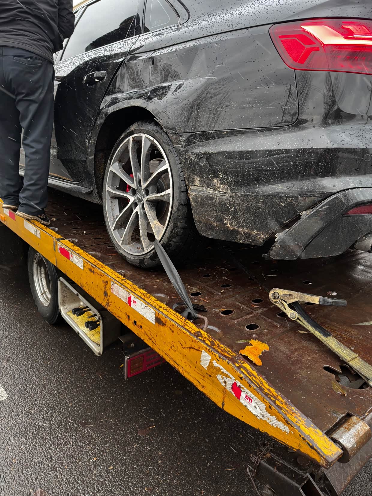 今天雨夹雪,从外环体育场往家走,刚过大桥,十字路口,我是主路直行,左侧辅路就冒出来个黄色的国家电网的车,直接把小4的左后轮给撞了,转了一个圈还,下车检查左后轮有外八情况,车已经被对方的保险人员拖走到4s店检查定损在开始维修了,责任划分是对方主责,我是次责,唉,上一台18款的45四驱五年跑了12万多,还跑了两趟全国自驾游啥事没有过,现在的24款小4临近两年碰到这么个事,目测双方保险人员看着说不算大事,但是需要检查,是否底盘羊角,下摆臂,避震,轴承是否有事了,对方态度也还可以但交警询问的时候跟交警说我超速啥的,问了好几遍,交警后台直接调监控说了没超速,有疑问自费检测,对方不吱声了,4s店虽然还没定损,但说估计快的话一周修好,慢的话十天,无奈了,二手卖的话折不折价也无所谓了也打算一直开着,修好就行了也说了4s店修全部原厂件,可惜了保费要涨了,大家开车要真小心了,你长眼睛真不代表别人也长眼睛,自己的保险人还问了大灯没事就行,不然24款的新款矩阵式熏黑大灯貌似要5w冒头唉。