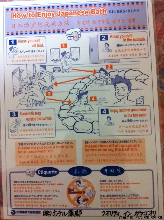 要了个温酒,过瘾,吃饱喝足回酒店休息了。今天的酒店在中部带温泉的,到酒店就急忙问导游温泉地址,把泳衣带上。哈哈,谁知道日本泡汤是不穿泳衣的,这个酒店提供的是室内的男女分开的,泡之前得先洗干净,哈哈看到一个个坐在小板凳上洗澡的人,没敢坐,也没有泡,怕不干净。听说明天住的是很好的温泉酒店。明天再说吧、、、