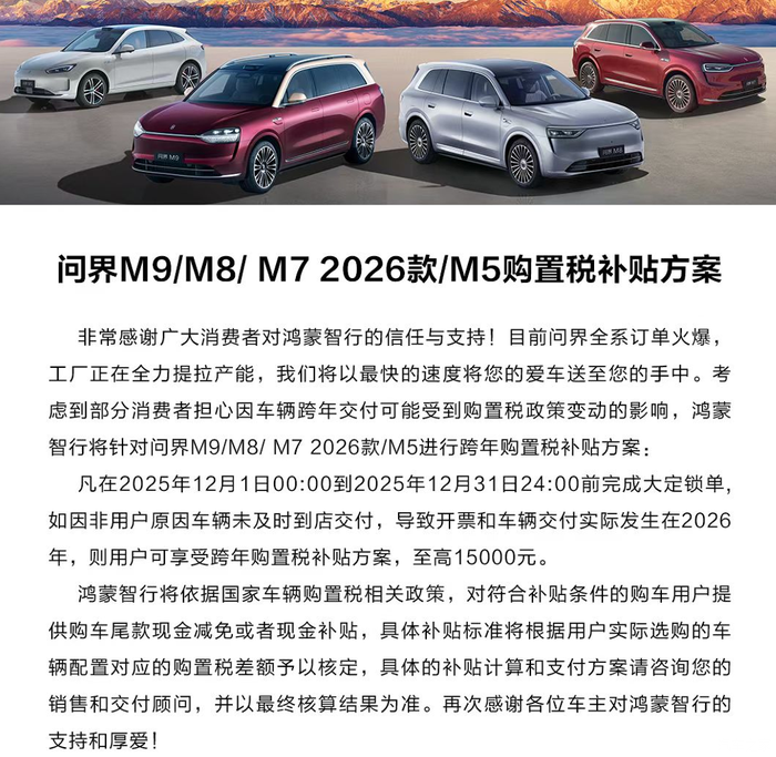 表弟挺喜欢,但纠结现在订车会等很久,也担心万一拖到明年,购置税政策变了咋整。我乐了,直接给他看问界最新购置税补贴政策:年底前订上,如果真因为交***到明年,能享受跨年购置税补贴方案,最高一万五。他这一看心里就踏实了,很快就下了单。