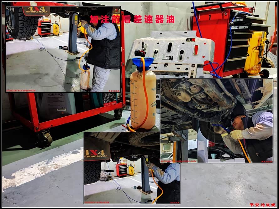 看着架起来的车,正想着这齿轮油怎么才能加注到桥壳里,这时看到维修师傅拿来个罐子,询问后知道就是把油先加注的这个罐子里,然后再通过气泵加压,把油顶出,加注到桥壳里。