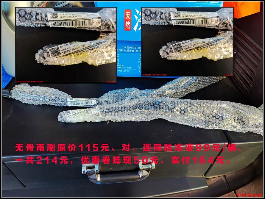 优惠卷是有消费限额的,是要达到多少钱才能用,所以算计了一下,想到两年的车了,雨刷虽然现在没什么问题,但也快到更换的时候了,车友群里讨论过这个车的雨刷,看到貌似不太好找,所以就在店里买了,虽然价格比网上会贵不少,但不用费心去找了。