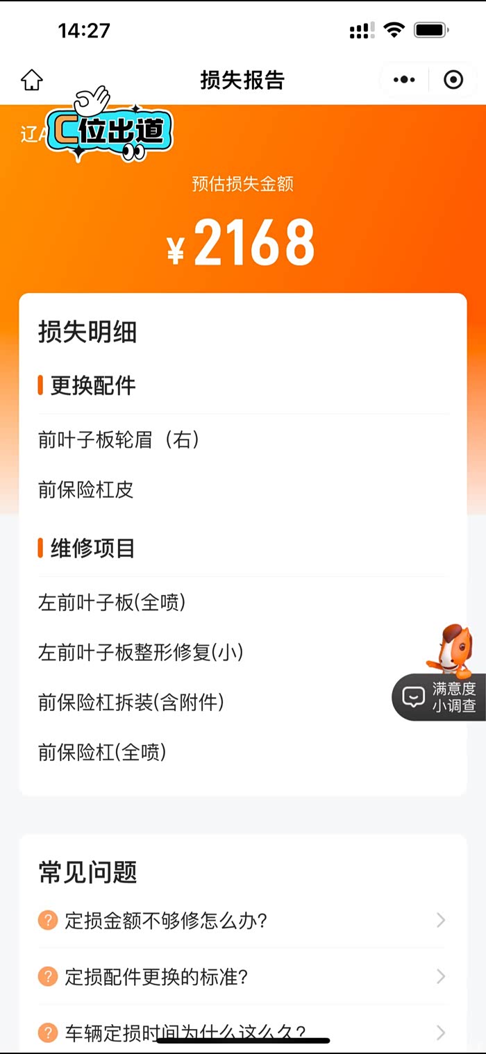 定损:根据自己时间安排去定损,因为定损需要拆前杠和翼子板,所以推迟到五一之后才安排定损,把车子钥匙一丢在售后,就可以走人了(理赔时间最好控制在一个月以内,有时间要求的)