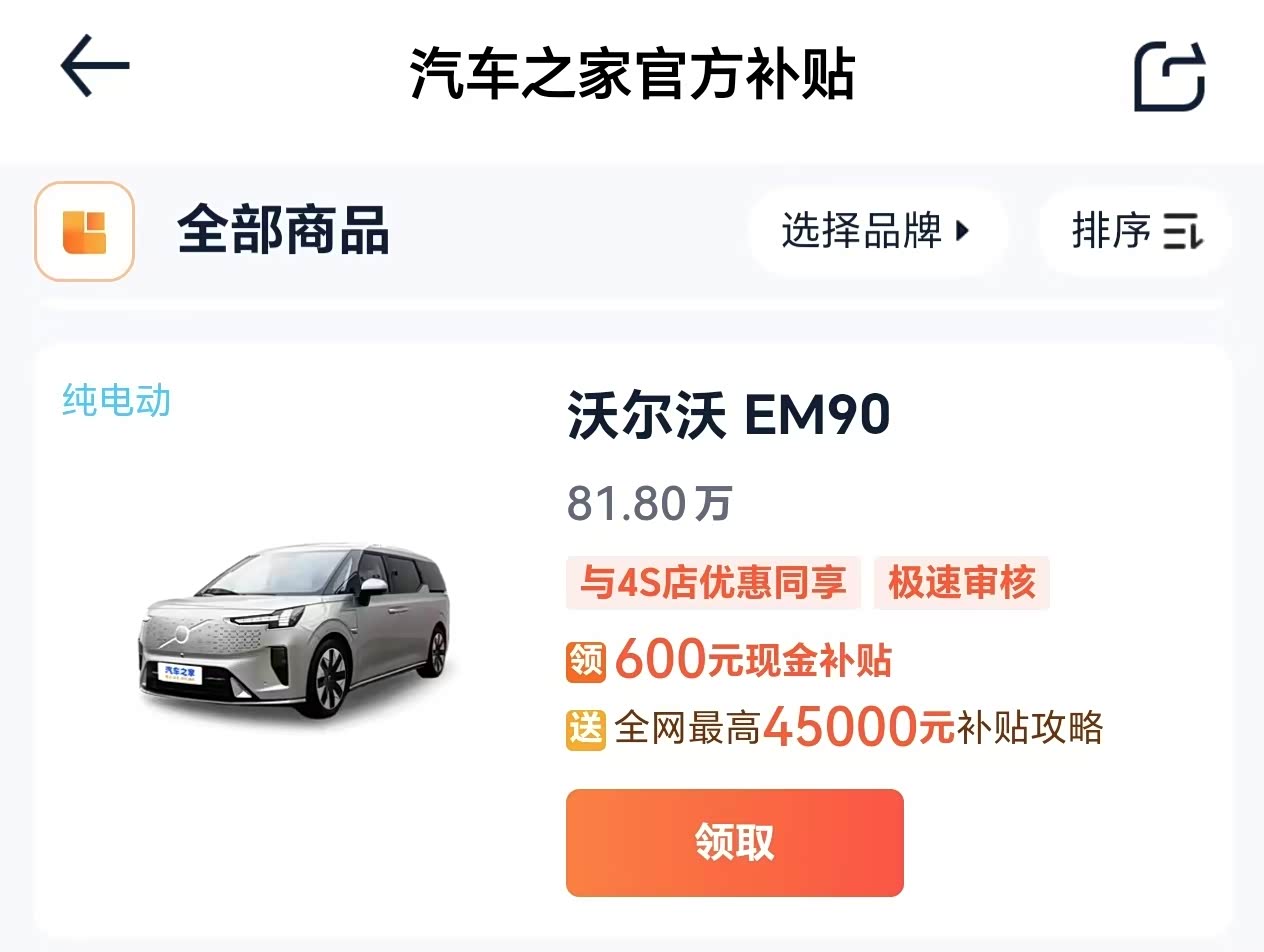 三、最后还有惊喜,也是很多车友最容易忽略的就是汽车之家平台的专属补贴,可以和任何4s店优惠或车企补贴同时享受,只要在咱们平台领取之后再去下订单就能领到。目前针对沃尔沃EM90的专属补贴是600元现金,非常不错了。