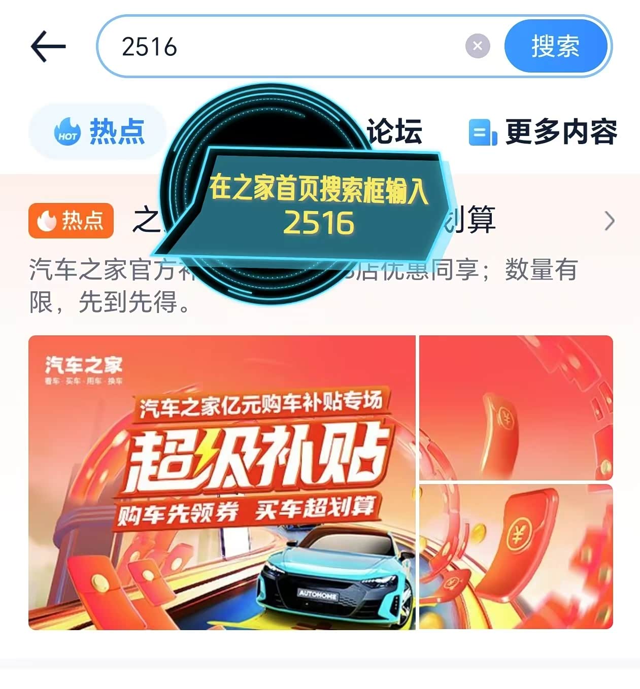 超级补贴方法二:在汽车之家APP首页上方搜索框内输入专属补贴码2516,进入活动页面选择心仪的车型即可领取。