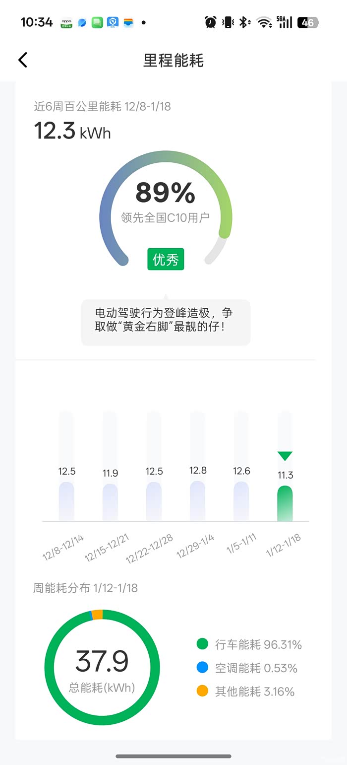 3、能耗整体不错,没有续航焦虑。虽是正力电池,但能耗还是可以的。能耗跟天气有关,浙江最近6周,天气基本都是晴天,气温也比较高,所以,基本上没怎么开空调,平均能耗保持在百公里12.3kwh,充满电动态续航可以达到590公里,充一次电一般跑400-480公里。夏天能耗要高点,大概在百公里16kwh以上,有时候超过20kwh。当然能耗跟个人驾驶习惯也有很大关系,车辆一般设置驾驶模式为舒适模式,动能回收设置中或强,平时开车比较平稳,没有急加速急减速,提前预判红绿灯,过不了提前减速,增加动能回收,基本上很少用急刹。