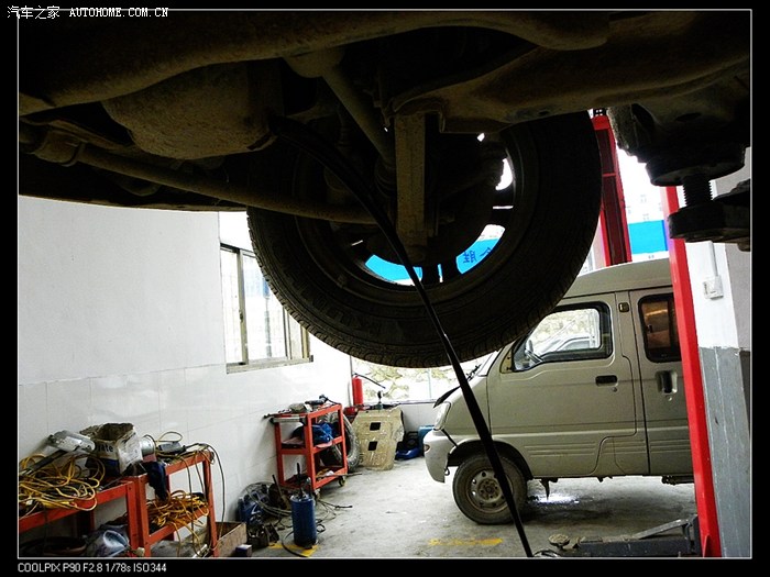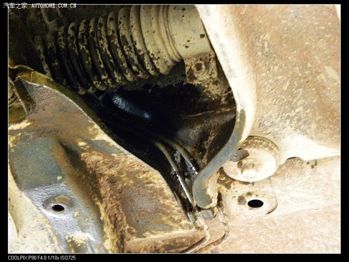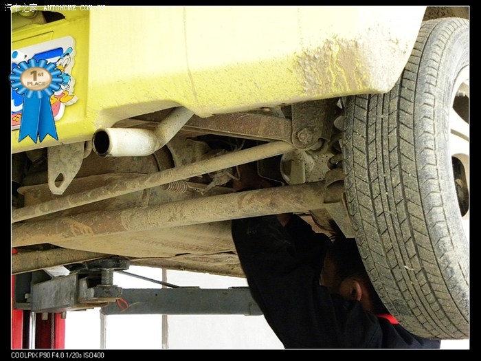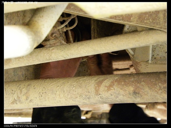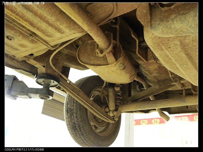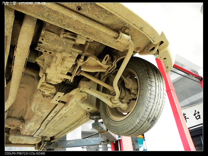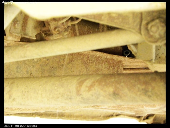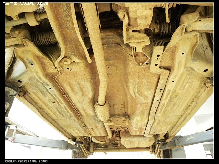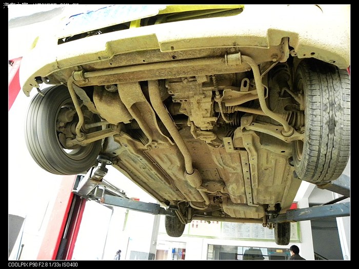 发动机怠速运转清洗的时候,拍了点底盘的照片。因为前两天跑了趟乡下,底盘和车子四周都裹满黄泥巴: