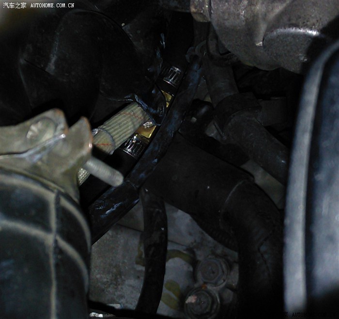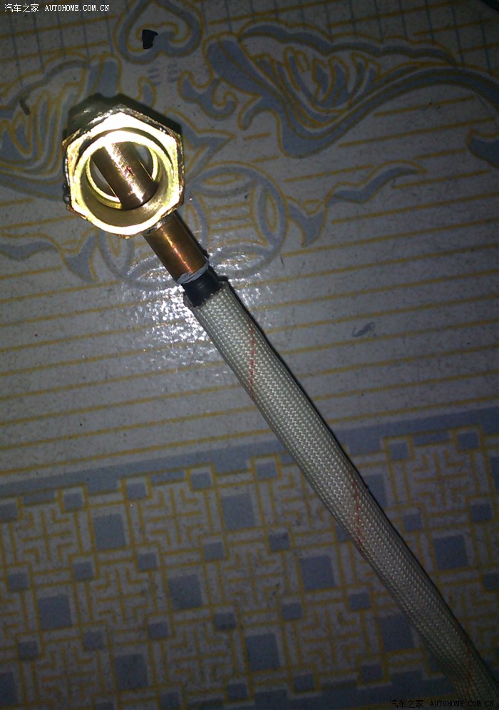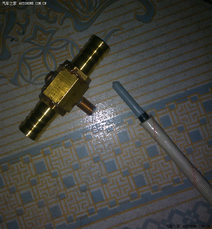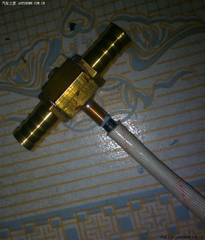 温度传感器外壳没有找市场常见的28mm三通,因市场的三通温度采样是采取节温器后面的水温,这个温度不准的.要采取节温器之前的温度才对.因此传感器三通采用自制的16mm三通,接在暖水管处与节温器直通.