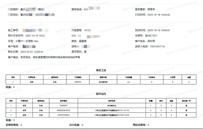此次的保养因为是搭着专项活动开展的,所以工单显示的是保修,可以理解,毕竟在修和保养的维度,维修更重要一些。项目主要是转向器检修,包含了更换转向机总成,避免原转向机线束裸露的潜在风险。保养检查主要有外观检查,轮胎检查,电池检查,动力总成检查,因为空滤在5000公里时刚刚更换过,所以这次没有换新。按照小鹏保养的规范流程,添加玻璃水,洗车后交付是必不可少的。