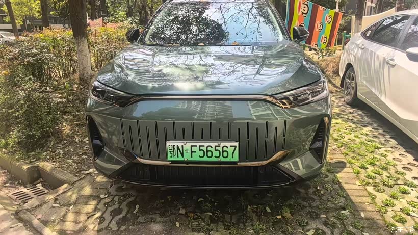 前脸的竖条格栅跟这个颜色太搭了,金属质感的线条衬得整车很硬朗,又不失细腻。车灯是细长的分体式,晚上亮起来特别精神,跟绿色车身的清冷感绝配。