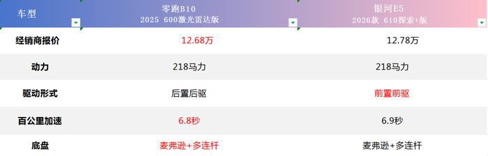 零跑B10搭载了一台后置后驱永磁同步电动机,其电机功率为218马力,总扭矩为240牛米,百公里加速6.8秒,银河E5的电机功率也是218马力,不过它的总扭矩要强一些,达到了320牛米,从参数上看,其实银河E5还要略强一些,但是这款车是前置前驱,加上驾控表现不如零跑B10,所以它的百公里加速为6.9秒。