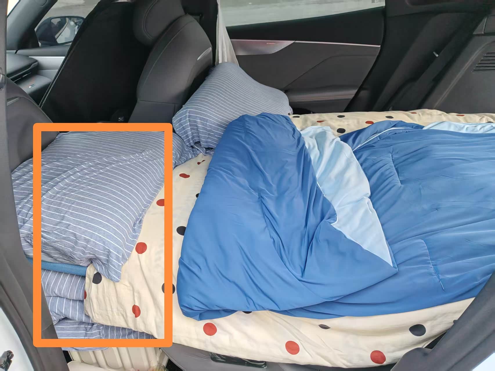 (第一天床车问题)因为我们是纯电车早就计划住车里体验一下床车,几个原因吧,第一是为了省钱,因为之前出去玩的时候体验过住宿涨价好几倍,我们是普通老百姓,就感觉花那种钱是冤枉的钱,也试着住过洗浴中心这种,假期人多到过道都是人,而且感觉也不卫生不安全,还不如住车里,而且我对住宿要求不是很高,安全,干净就行,这两点床车也都能勉强满足,所以接下来就要解决床车最大的难度上厕所问题,在网上找了一些软件,会有车友在里面分享哪里是适合床车露营的,一般都在比较大型的公园附近,这样的地方都有24小时候的卫生间,还有一些公众号也会有车友分享一些适合的营地、我们按照车友分享找到了一个算上既安全附近大概走路几分钟也有卫生间的地方就住下来,但是因为第一天住床车,我们的车后备箱跟后座椅虽然能放倒后为纯平、而且我们也用了床垫和厚的被褥努力找平,但是可用长度也就1.6米,我老婆还够用,但是对我这个身高1.78米的人就不友好了,所以第一天无论是头放在折叠起来的座椅(哪里会有一点高),还是掉过来把脚放在高的地方,都是很不舒服的,所以决定第二天想想办法解决这个问题。