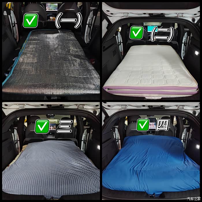 铺床的1234.我是用的家里床垫,如果单独买车用的床垫平时使用率太低,感觉这么铺起来也很厚