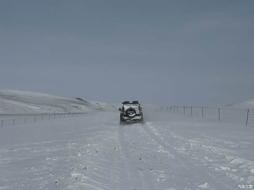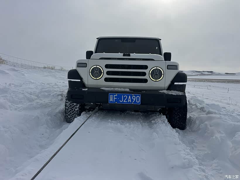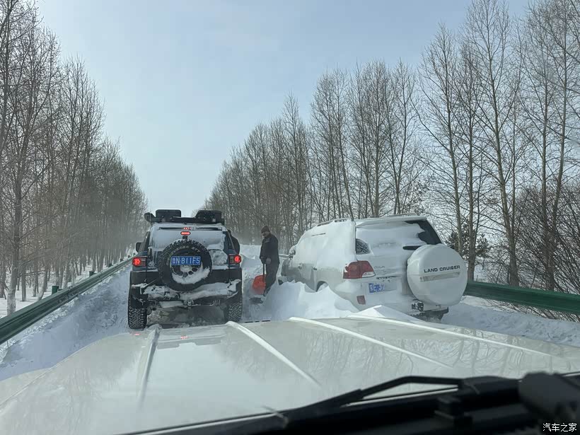 我真多余拿铲子,那雪厚的直接顶前桥上面,这得挖哪辈子啊?于是我用车台呼叫FJ,让FJ从前面拉我一下,顺便把地上的雪刮平了,方便后车前进。