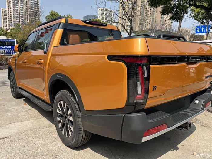 一进店,看到Z9GT 的第一眼,感觉比我预想的要“大块头”不少。方方正正的车头就像一块黑色的大砖头,中网采用熏黑设计,日行灯如一条光带横贯其中,就像一把尺子把前脸清晰地切成了两半。轮眉向外扩张,离地间隙目测大概有一拳半,感觉都不用改装,直接就能轻松上道牙子。我绕着车走了一圈,车尾的设计最让我心动:货箱盖板可以快速拆卸,三秒钟就能变成敞开式货箱,长板冲浪板横着放进去都没问题,这下我都不用再花钱买行李架了。