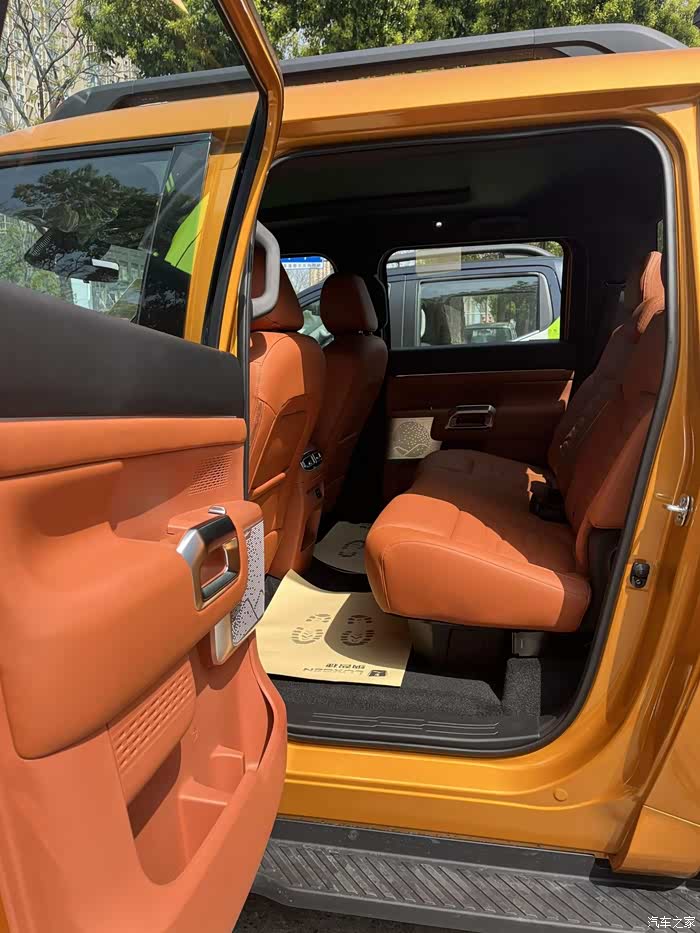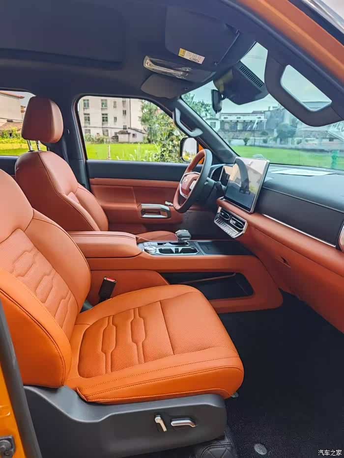 坐进驾驶舱,发现座椅是防水的复合皮革材质,我用湿手摸上去,居然没留下水渍。把前排座椅调到最低,像我身高176cm,头顶还能剩下一拳多的距离,视野比轿车开阔了一大截。中控配备了14.6英寸的大屏,菜单里设有快捷按钮,像一键关窗、切换内循环这些操作都很方便,遇上沙尘暴天气,再也不用担心沙尘灌进鼻子里。而且中控屏幕下边都是实体按键,我觉得实体按键比触屏更实用。现在好多新车都把大量按键集成在中控屏幕里,虽说触屏看起来科技感十足,但实际操作起来并不方便。Z9GT的整体尺寸比传统皮卡大了一圈,所以无论是内部空间还是车厢空间都非常宽敞。后排坐三个成年人都不会觉得拥挤,前排就更不用说了,驾驶位和副驾驶位的空间都绰绰有余。