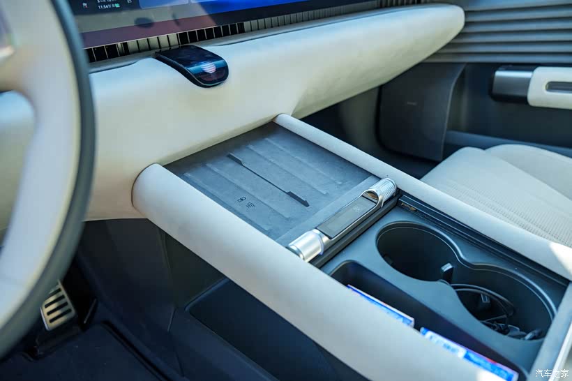 中控台下方设开放式储物格,内置50W无线充电模块,非常贴心实用。