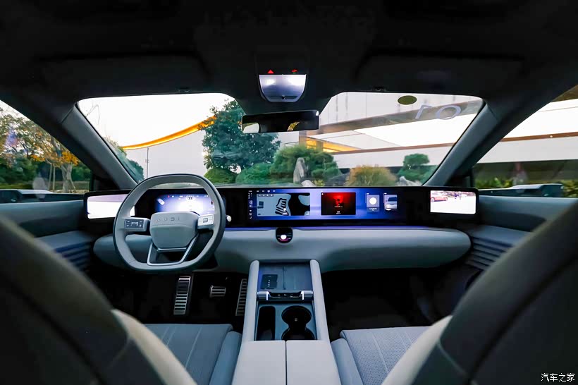 内饰采用极简设计,以“实用科技+豪华质感”为核心,人机交互界面配备59英寸全景屏系统——由12.3英寸仪表屏、27英寸4K中控屏及两侧7英寸电子后视镜屏组成,视觉效果震撼且不刺眼。