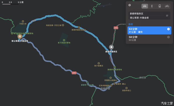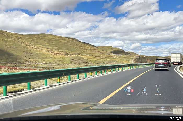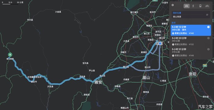 从成都出发到塔公草原,会途径京昆高速、雅叶高速,抵达康定下高速后走国道318前往,全程358km,大概会行驶5个半小时左右。沿途的雅安天全服务区、新都桥服务区都有换电站,所以即便进318会一直爬坡导致车辆电耗较高,但也丝毫不用续航焦虑,L90的85度的电池完全够用了