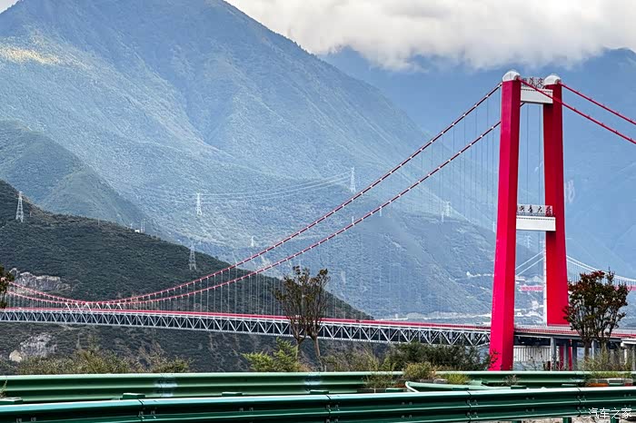 在康定下高速前会经过兴康特大桥,这是甘孜藏族自治州泸定县境内的一座大型桥梁,位于大渡河之上,为川藏高速公路组成部分,也被誉为川藏第一桥。在蓝天白云下,披上“红妆”的兴康特大桥在阳光照射下,熠熠生辉、宏伟壮观
