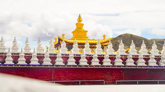 塔公寺再往上走一点,就是塔公草原木雅金塔了。这座金塔由宁玛派竹庆寺活佛多吉扎西于1997年捐资兴建,建造时使用约80-100公斤黄金(存在不同记载)。该塔为坛城式佛教建筑,分三层供奉显宗、密宗佛像及佛教经典,外檐装饰金鹿等镀金饰物,建有383米转经廊与470个转经筒。金塔开光时曾显现五彩祥云与七色光环的宗教祥瑞,其周边被雅拉神山等八座神山环绕,形成"莲师道场"宗教景观,并与塔公草原、雅拉雪山共同构成旅游摄影地标