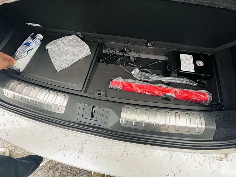 在后备箱盖板下是,启动电瓶和随车工具以及一个临时应急充气用的充气泵。