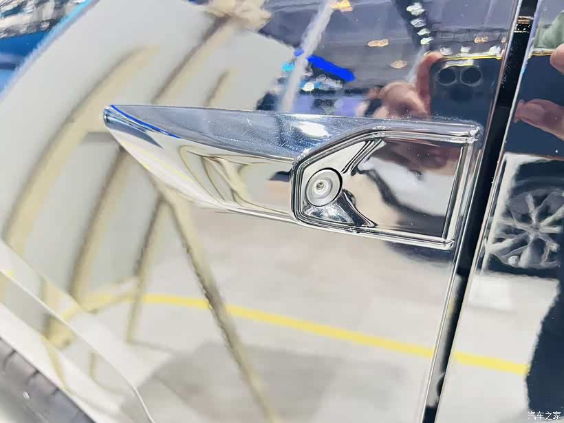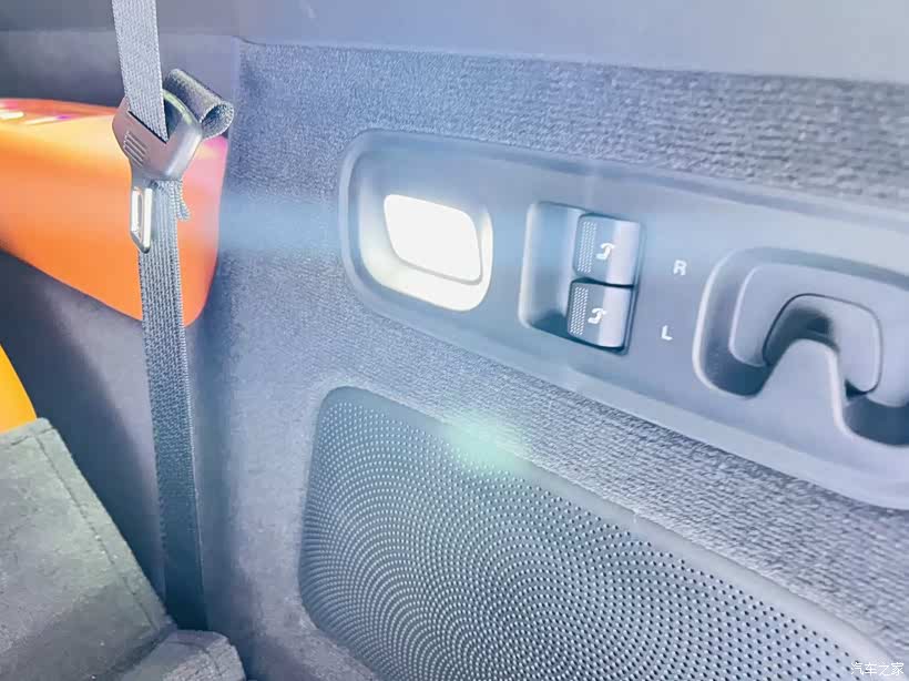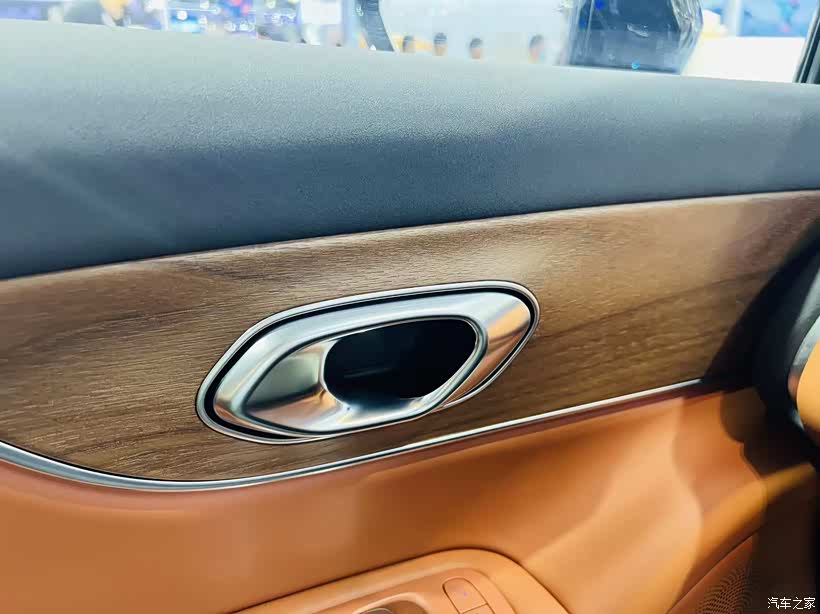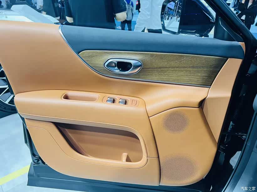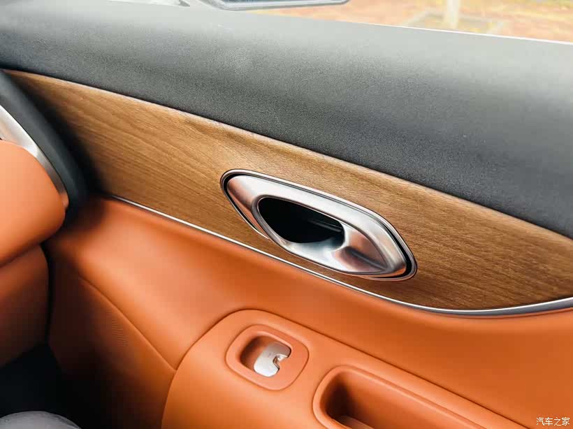 打开主驾车门可以看到车门内门板上配有真黑胡桃木实木装饰板,配以真皮材质包覆内门板,高级感瞬间提升。在前门内门板内还内置有双发音单元,高低分频,让车内的声场效果更加突出。